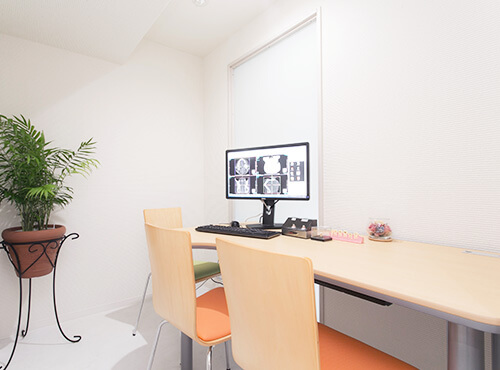 初診カウンセリングと検査を終えた後、セカンドカウンセリングを受けていただくお部屋です。モニターを設置し、レントゲン写真や症例などをお見せすることができます。個室でプライバシーが保たれていますので、どんなことでも安心してお話いただけます。